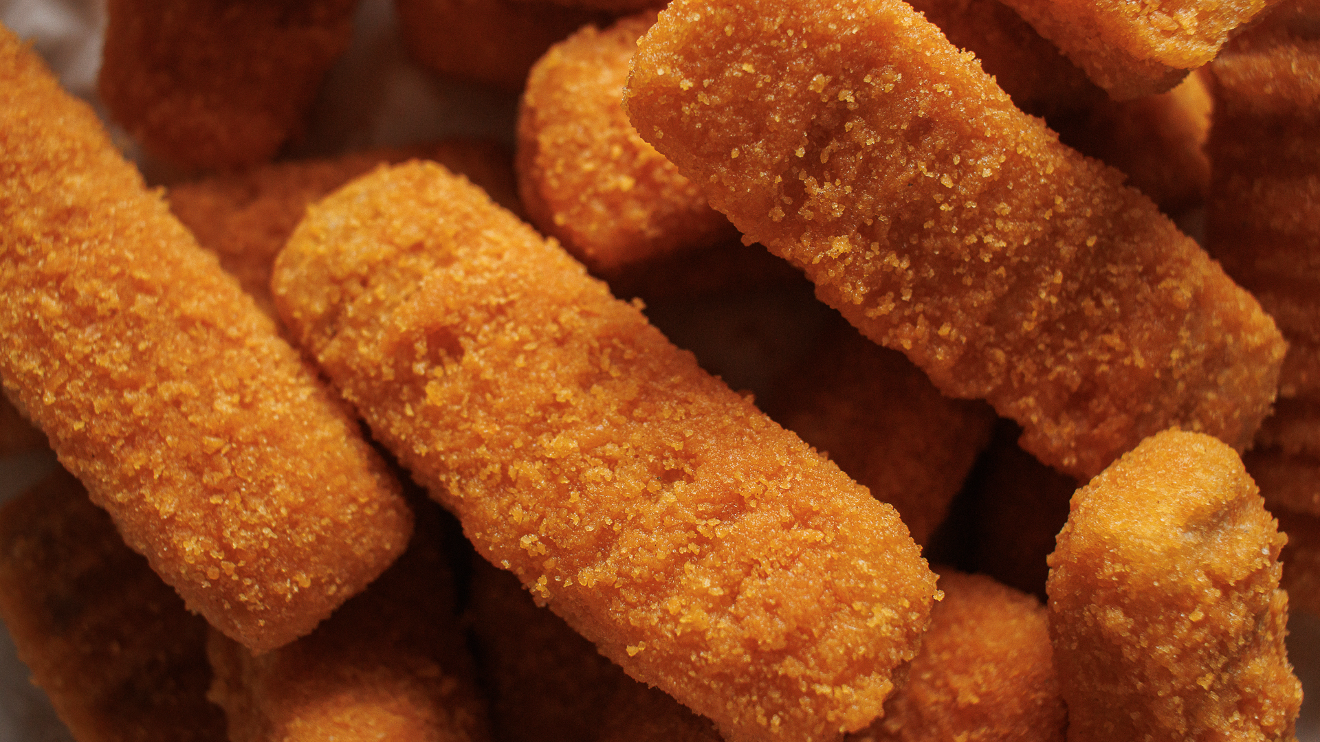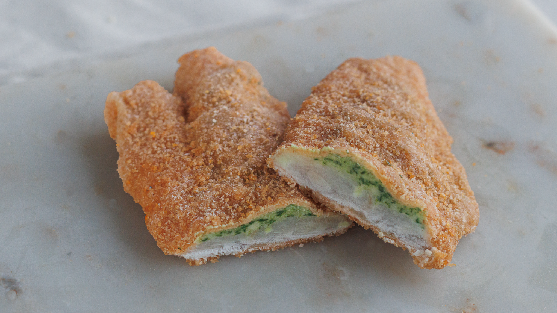 Filet de Merluza s/e rebozados rellenos (kg.). Rellenos: Crema de espinaca / Mozarella